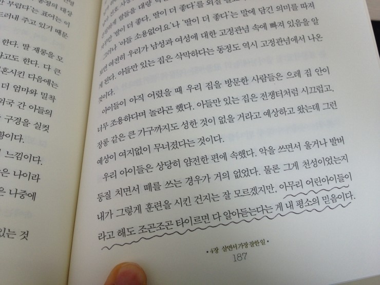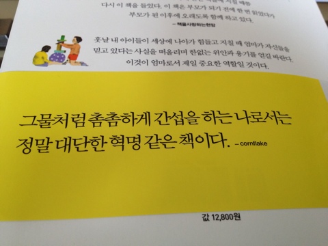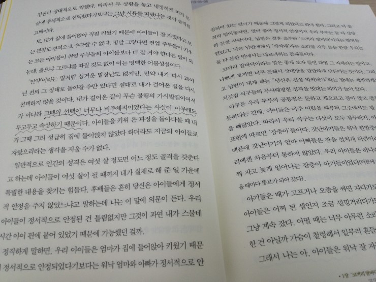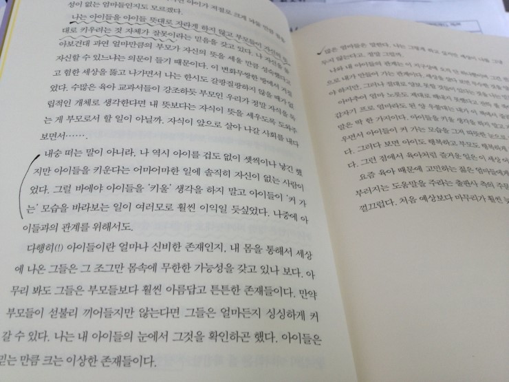 착각으로 인해 책을 다시 읽는 사태가 벌어졌지만...참 좋은 기회였단 생각이 들고 역시 책을 읽을 때마다 내가 처한 상황에 따라 전혀 다른 느낌과 생각을 전달해준다는 걸 다시 한 번 깨달았다. 그래서 좋은 책은 소장해야하는가? 이번에 후편(?)으로 나온 다시 아이를 키운다면을 꼭 봐야겠다.