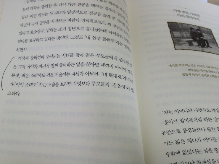 적성과 창의성이 중시되는 시대를 맞아 젊은 부모들에게 중요한 것은 그저 아이가 자기가 진짜 좋아하는 일을 찾아낼 때까지 아이의 작은 몸짓, 작은 소리에도 귀를 기울이는 자세가 아닐까. ‘내 뜻대로가 아니라 아이 뜻대로사는 모습을 보려면 무엇보다 부모들의 참을성이 필요하다.