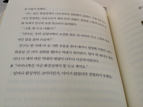그의 이론은 간단했다. 어머니가 너무 깔끔한 집안의 아이는 상상력이 빈곤하기 때문에 창의적이지 못하고 결국 공부도 잘할 수 없다고. 인간의 상상력은 어질러진 공간에서 마음껏 피어날 수 있다고. 한국에 와서 보니 친구들이 죄다 아이들 공부 잘하는 게 소원이라고 말하면서도 실제로는 아이들의 발전을 봉쇄하고 있어서 아주 답답하던 차였다고 했다.