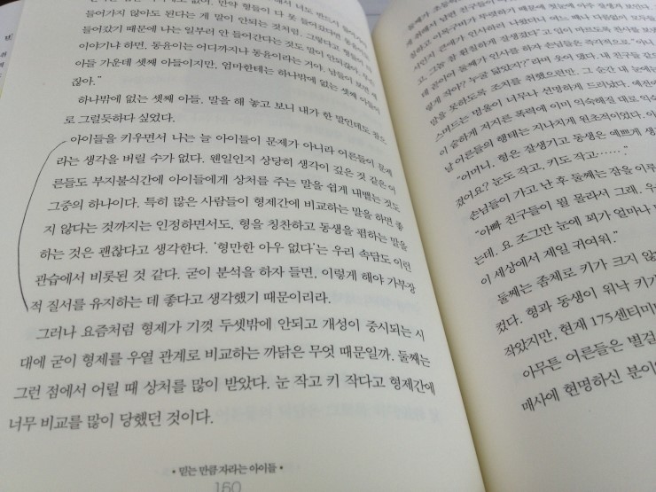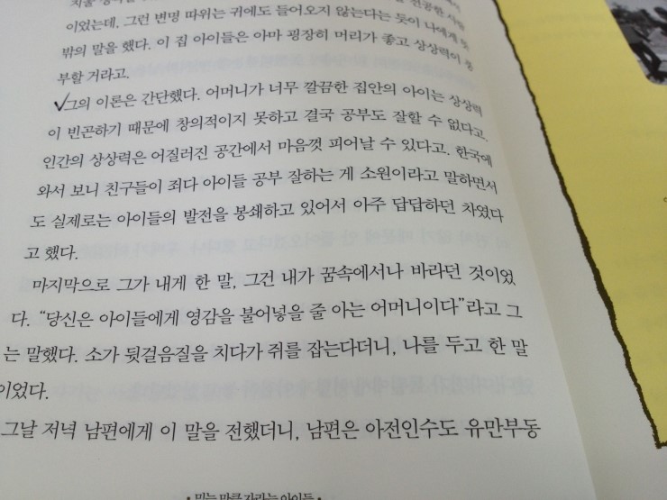 이게 가장 기본적인 육아의 길이겠지만 정말 모든 아이가 바른길로 가는 게 맞을까? 가장 쉬운 예로 아이에게 예의를 가르치는 이유가 뭔가? 바른길이라는 기준에 부합하도록 하기 위해서이다. 더불어 살라고, 양보하고, 배려하라는 것. 그러나 내 아이 귀하다고, 오냐오냐 괜찮다~하는 동안에 아이는 버릇없고, 제 멋대로, 자신만 생각하는 아이로 큰다. 모든 것을 온전히 아이 뜻에만 맞춘다는 건 좀 비약인 듯 싶다. 그렇지만 엄마는 이렇게 자랐음 좋겠어, 엄마 생각에는 넌 이걸 해야 해. 00이네집 아이는 이걸 배운다더라, 00이집 아이는 몇 시 까지 공부한다더라. 너도 그렇게 해라 그 걸 하지말라는 말으로 보는 게 맞을 듯 하다.