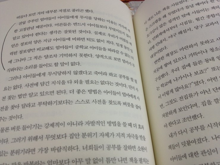 맞는 말씀. 바야흐로 우리꼬맹이는 왜요?물음시대에 도래했는데(도래한지 1년이 되어가는 듯하긴 하다..^^:) 이거 대답해주기가 여간 어렵지 않다. 아주 당연하다고 생각하는 것들에 대해서조차 왜요?라고 묻는데 꼬리에 꼬리를 무는 질문은 무슨 개미지옥같이 빠져나올 수가 없다. 그때 내가 모든 걸 다 안다고 대답을 해주자면 그건 거짓말이다. 그래서 나는 너는 왜 그렇게 생각하냐고 다시 물어보기도 하고, 같이 찾아보자고 하기도한다. 지금도 이런데 앞으로는 어떨까? 요즘 교과서가 바뀌어서 스토리텔링식의 상당히 고난이도의 문제들이 제시된다고 하던데 쿨럭. 어서 아이가 묻기보다는 스스로 사전을 찾는 법을 길러주어야겠다.