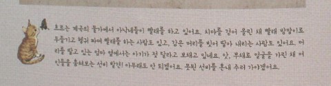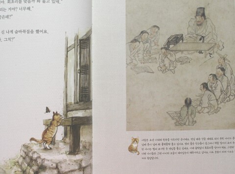 나비와 함께 툇마루에 다리를 올리고 빠꼼히 서당 내부를 바라보는 고양이의 모습과 김홍도의 <서당>그림이 어우러져 웃음도 자아낼 뿐만아니라 이 책을 읽는 아이들로하여금 더욱 또렷히 그림을 기억할 수 있도록 이끌어주지 싶다.^^*