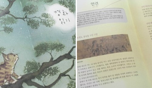 책표지다. 가운데 창문이 있는 자리가 실제로도 뚫려있어 멋스럽다. 내 눈에 띄었던 것은 멋스러운 표지만큼이나 딱 어울리게 쓰여진 제목 폰트다. 이 책이 우리 옛그림에 대한 책이니만큼 폰트 또한 어울려서 '아름다운 우리 그림 우리 문화'라는 부제와도 맞아떨어지는듯하다. 덧붙여, 은은한 표지그림도 그 느낌을 한껏 살려준다.