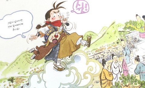 이 책은 사진에서 보는 것과 같이 두 가지 서로 다른 삽화로 그려져 있다. 구름을 타고 있는 전우치와 롤프는 뒤에 배경처럼 펼쳐진 삽화 속에서 튀어 나오듯한 느낌을 준다. 그렇기에 같은 시대 사람이 아닌, 다른 세계에서 온 듯한 느낌이 물씬~~!^^