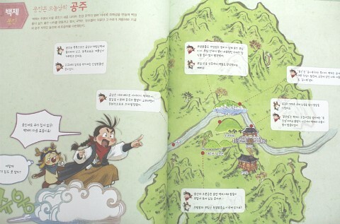 웅진.... 지금의 공주지역임을 설명하면서 백제가 웅진에 도읍을 정한 이유도 알려준다. 지도를 살펴보면, 가운데 흐르는 '금강', '무령왕릉', 백제의 도읍지였을 당시 웅진성이라고 불리웠던 '공산성', '송산리 고분군' 등을 간략하게 소개하고 있다.