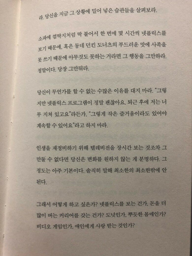 그리고 마지막으로 가장 뜨끔해 사진까지 찍었던 부분을 덧붙여 본다. 자기전에 넷플릭스 보다가 이 책을 펴들었는데 화들짝 놀라 헛웃음까지 나오더라는.