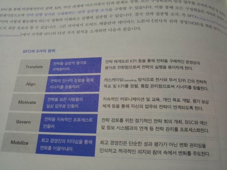 SFO의 5원칙. 실천적 용어로 구체화, 시너지 창출, 모든 사람의 일상업무화, 지속적인 프로세스화, 탑의 커미트먼트