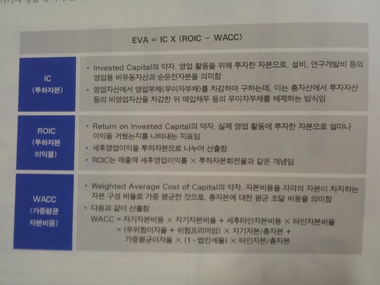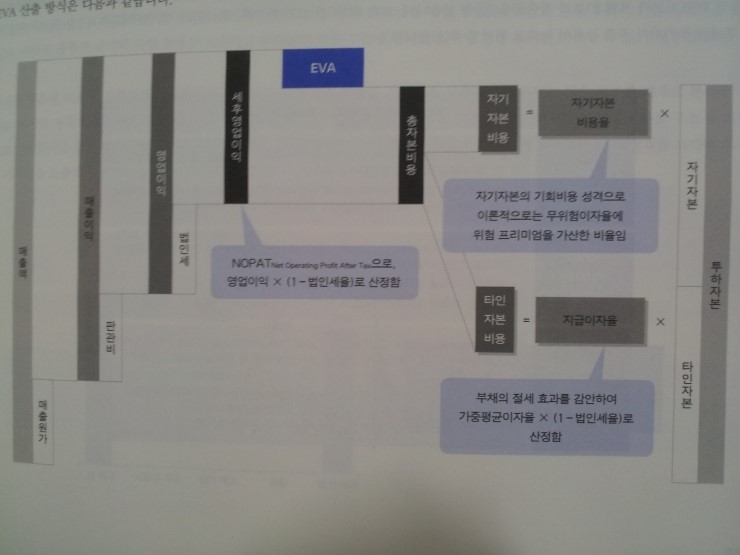 매출액-매출원가=매출이익-판관비=영업이익-법ㅂ인세=NOPAT-총자본비용=EVA(막 쓴 식).. 시각적으로 훌륭하게 제시된 기초개념들