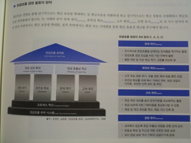 현금흐름경영의 4원칙. 장애 제거, 유연성 확보, 고속 회전, 균형유지
