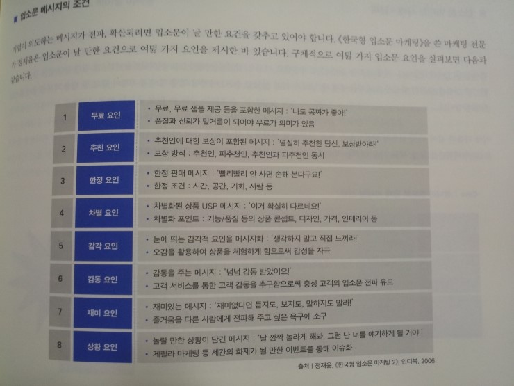입소문 8요인 무료, 추천, 한정, 차별, 감각, 감동, 재미, 상황. 다른 책들에서 쓸만한 엑기스들을 잘 뽑아내 실어주는 걸 보면 이 책을 얼마나 공들여 쓴 건지 감사할 지경이다.