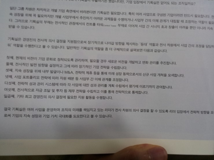 기획실의 역할. 비전 개발과 정착, 방향 제시, 신규사업개척, 이해관계조정, 성과관리, 재무전략, 최고경영진 지원활동