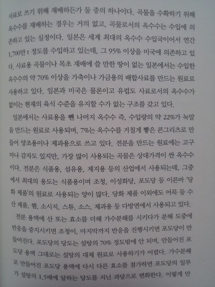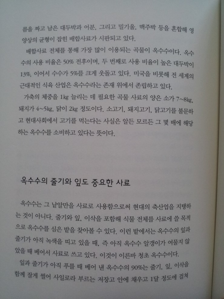 사료의 반은 옥수수. 미국은 연간 1인당 93.4Kg, 일본 28.5Kg의 고기를 소비하는데, 그것은 엄청난 양의 옥수수를 요구한다.