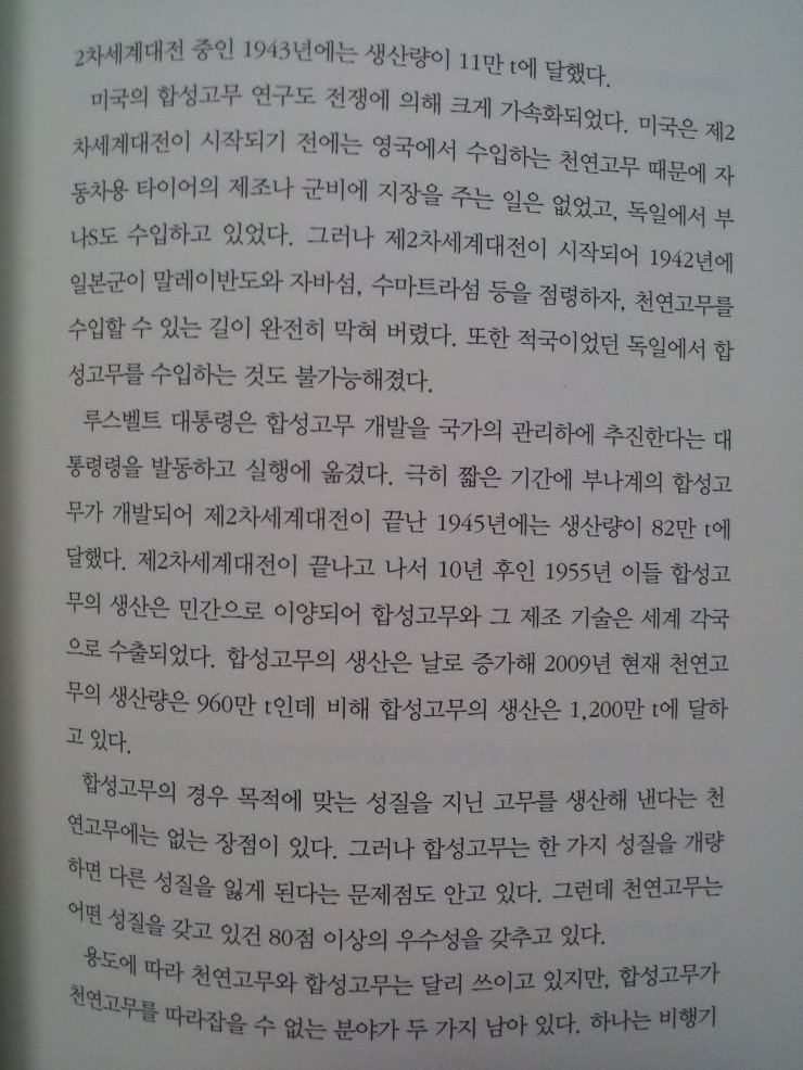 천연고무 960만 t, 합성고무 1200만t. 합성고무는 목적에 맞는 성질을 생산할 수 있으나 개량하면 다른 성질을 잃는다. 천연은 80점 이상의 우수성을 갖추고 있는데, 합성고무는 쓰일 수 없는 분야가 2가지 있다.