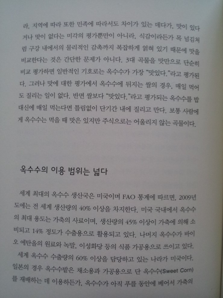 옥수수는 맛있다. 미국은 세계 생산량의 40% 생산(그 중 45% 사료, 14% 수출 - 세계 수출량의 60%).