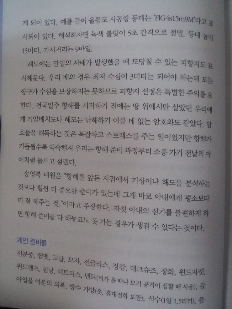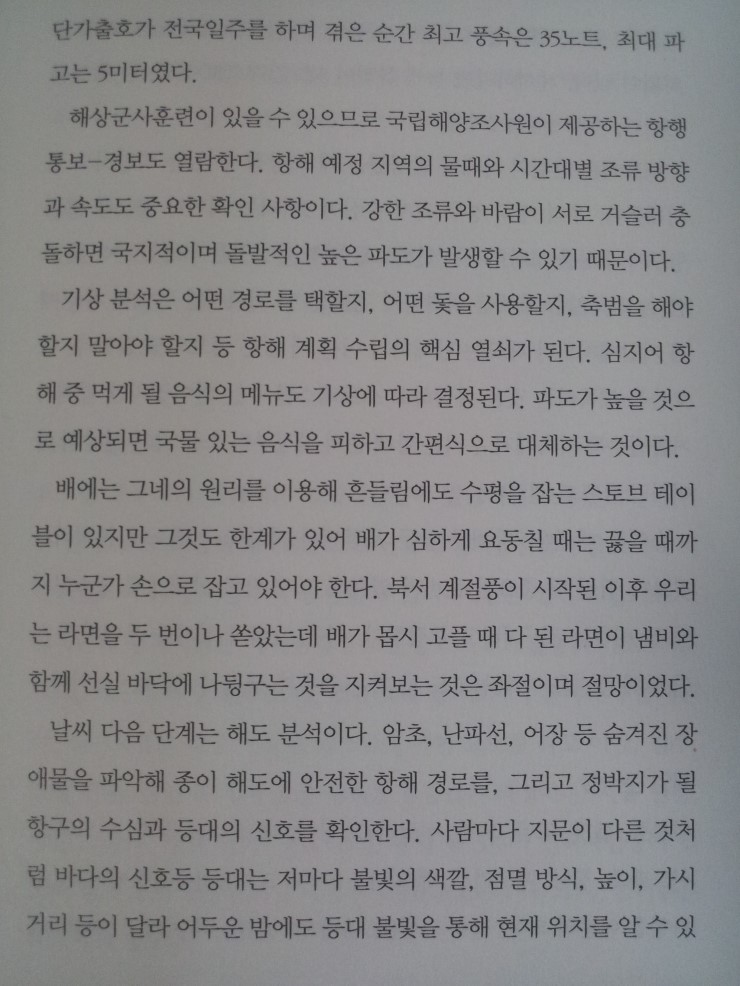 책을 읽고나서 살짝 황당한 바람이 생겨났다. 언젠가 내 배를 타고 동남아쪽으로 항해하는 것(잘하면 호주도 갈 수 있겠다. 미주는 좀 멀어서 뻘짓인 것 같고..) 그렇고 그런 아웃도어 액티비티에 질린 사람이라면 이 책을 읽고 요트에 도전해보길