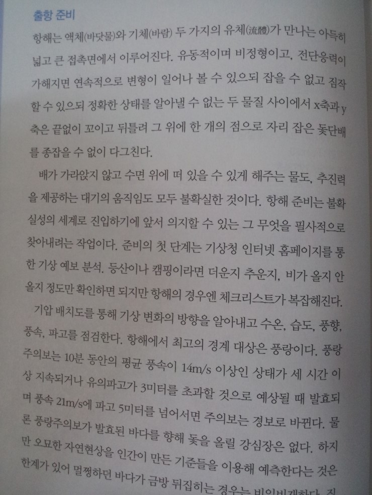 첫 인상부터 굉장히 좋았다. 별 수백만 개짜리 숙소(노숙)을 놔두고 왜 고작 별 5개를 고집하냐는 일갈부터 시작. 이후 요트란 무엇인지 간략하면서도 세심하게 설명해놓았다. 항해는 액체와 기체가 만나는 아득한 접촉면에서의 예술이다. 꼬이고 뒤틀리는 xy축 위를 항해하는 한 개의 점이라.. 과학적이면서도 철학적인 해석이 탁월하다. 요트를 탈 때 무엇을 주의해야하는지 알기 쉽고 친절하게 설명해주는 것도 맘에 든다.