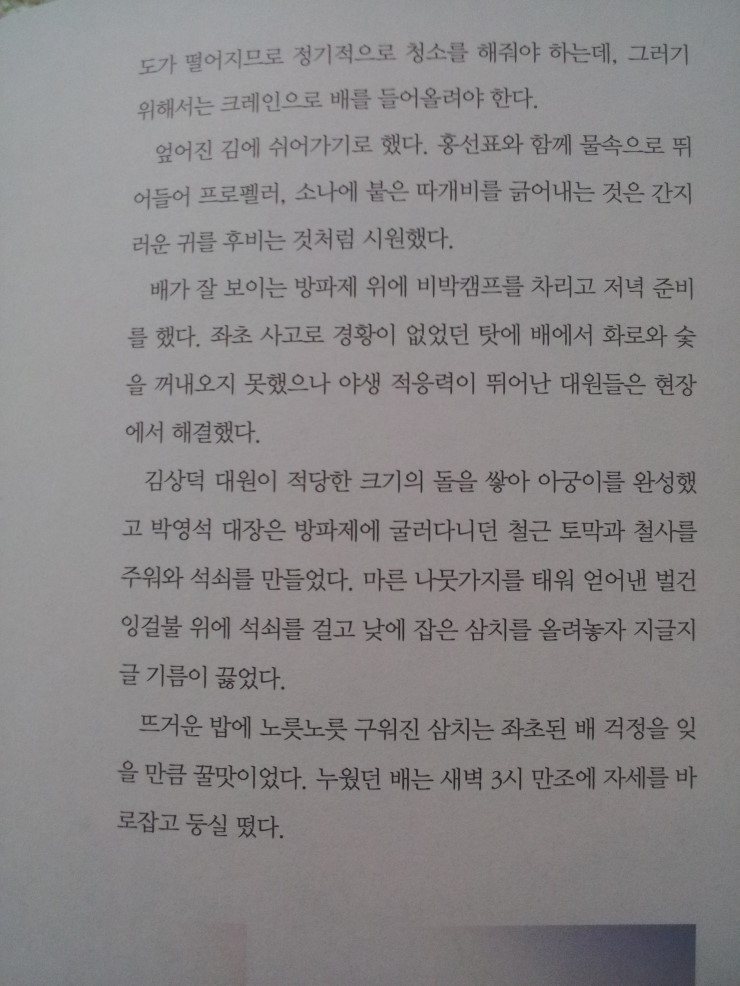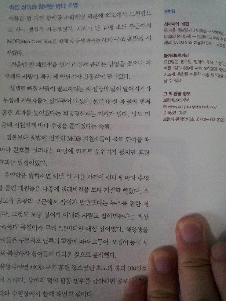 이 책이 좋은 건 옆에 깨알같은 정보도 함께한다는 것. 한반도의 서-남-동해를 일주하며 들른 각 항구들과 주변음식점 등에 대한 내용이 적혀있어 초보 입문자가 따라하기도 좋을 것 같다. 상어가 지나다닐 지도 모르는 곳에서 놀았다는 내용.