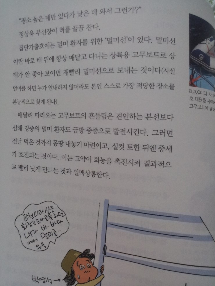 배이름이 집단가출호다 ㅋㅋ. 크루 면면도 특이하다. 시크한 십(ship)닥터, 클라이머, 방송PD, ... 그렇게 다양한 사람들이 모여 으쌰으쌰하는 게 재미있어 보였다. 뒤에 매달린 고무보트는 급성 멀미 익스프레스라서 바로 게워내게 만든다고 한다. 빨리 토해야 빨리 회복한다나