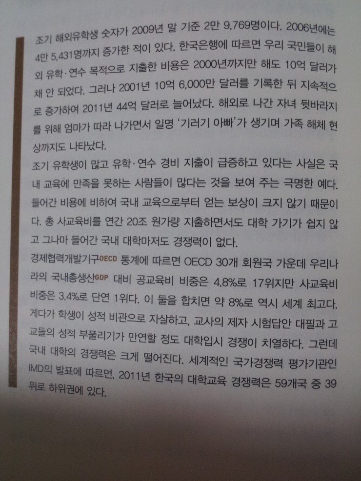 조기해외유학생 수(2009 29769, 2006 45431)와 비용(2011 10.6억$, 2011 44억$) GDP대비 공교육비중 4.8% 17위, 사교육비 3.4% 1위(합쳐도1위)