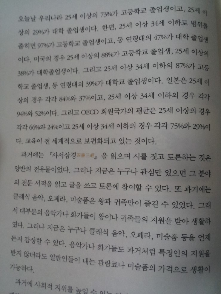 25세 이상의 73%가 고졸, 29%가 대졸(2534의 97%가 고졸, 47%가 대졸) 미국은 25세 이상의 88% 고졸 38% 대졸(2534 87/39) 일본은 84/37 94/52