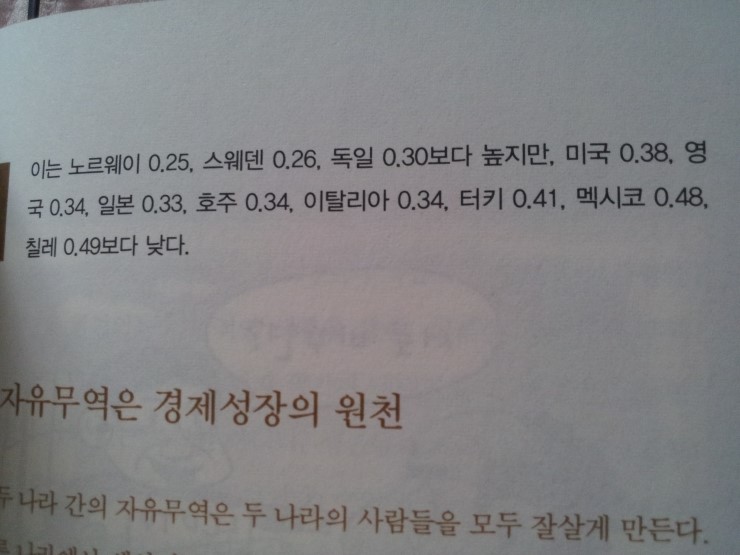 한국의 지니계수 0.32(노르웨이0.25, 스웨덴0.26, 독일0.3 미0.38 영0.34 일0.33 호주0.34 이0.34 터0.41 멕0.48 칠레 0.49)