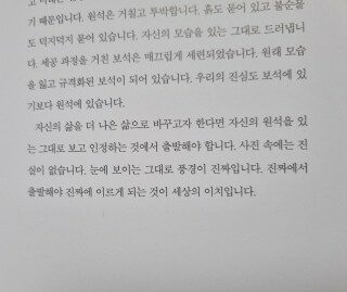 p147. 자신의 삶을 더 나은 삶으로 바꾸고자 한다면 자신의 원석을 있는 그대로 보고 인정하는 것에서 출발해야 합니다. 사진 속에서 진실이 없습니다. 눈에 보이는 그대로 풍경이 진짜입니다. 진짜에서 출발해야 진짜에 이르게 되는 것이 세상의 이치입니다.