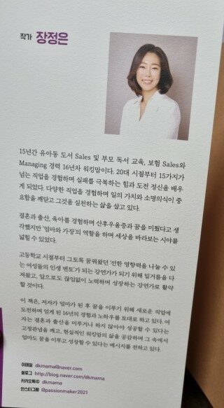 p220. 일을 쉬지 않고 할 수 있었던 이유는, 일을 통해 성장하고 싶었던 간절한 마음 때문이었다고 생각한다. 워킹맘이라면 일과 육아를 병행하며 포기하고 싶을 때가 많겠지만, 내가 하는 일에 대한 ‘가치’를 기억하길 바란다.