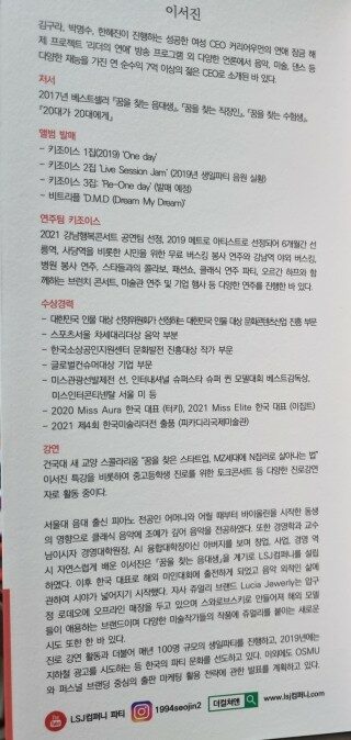 이 책은 이서진 대표의 개인적인 성장과정, LSJ컴퍼니의 소개, 함께 근무하는 직원들의 다양한 이야기, 책 출판 이후의 삶까지 소개된 내용은 창업을 하려고 하는 과정과 방향성을 제시하고 있다.