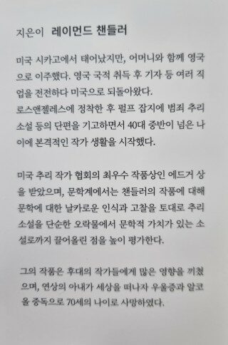 그가 만들어낸 필립 말로의 탐정의 이야기 <깊은 잠> < 안녕, 내 사랑> 등 그의 작품을 더 감상해봐야 하겠다.