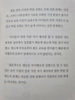 마시멜로를 먹는 아이보다 먹지 않고 기다림을 택했던 아이들이 자기 제어력과 성취도 관련 실험이였음을 말해준다. 하지만 최근 들어 가정환경, 교육수준이 달라짐에 따라 다시 생각해볼 이론이기도 한다고 말한다.