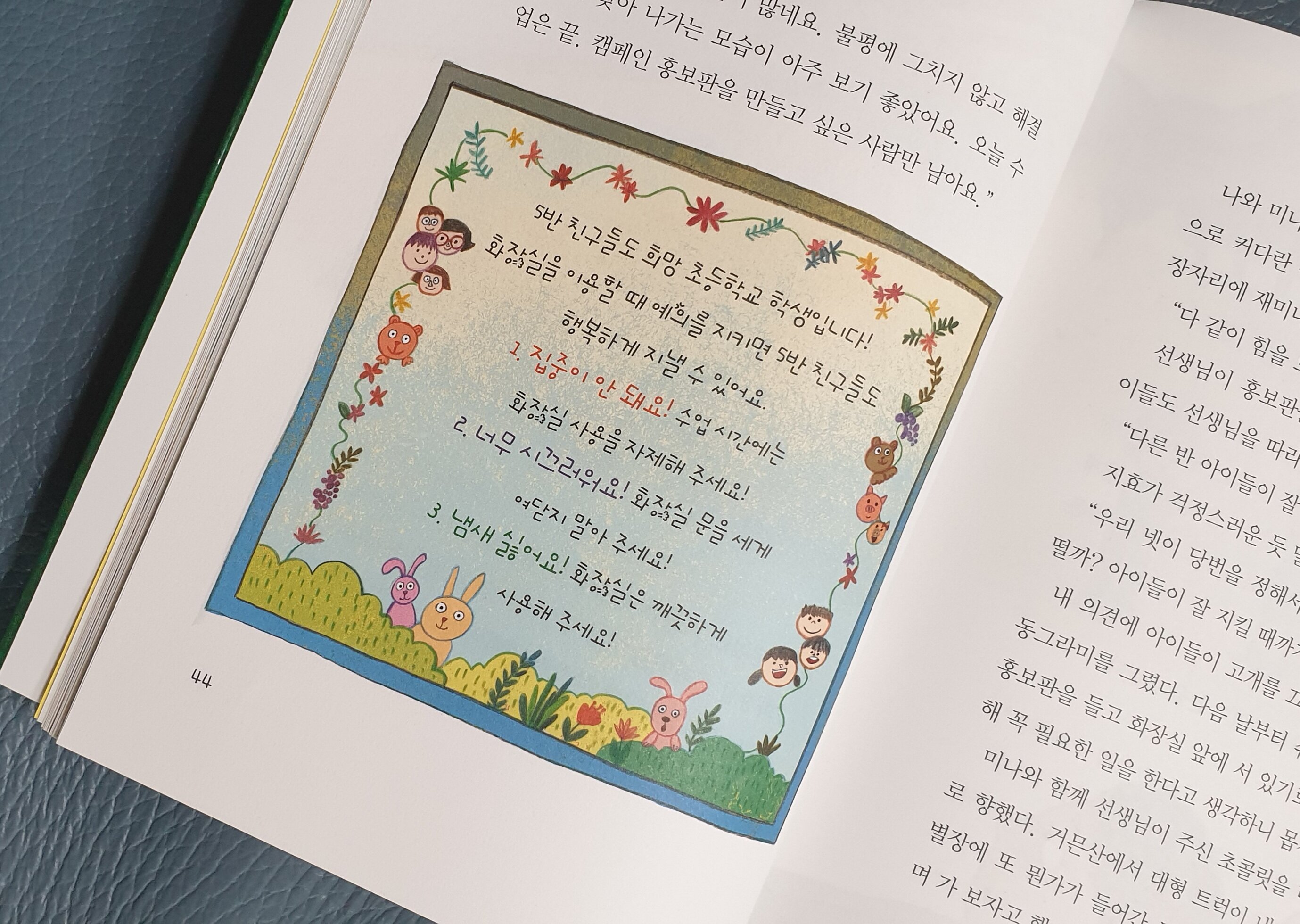 " 화장실은 누구에게나 꼭 필요한 공간이에요. 그러니까 어디에든 반드시 있어야 해요 그게 우리 교실 앞인 건 마음에 들지 않지만, 4학년 다섯 반 중 한 반은 꼭 이 자리일 수밖에 없어요. "