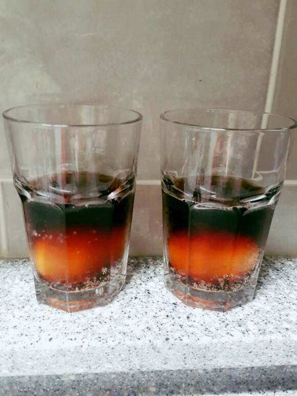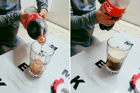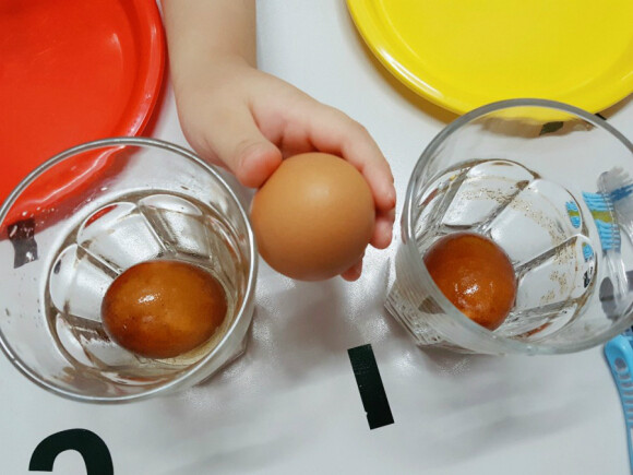 (컵 안에 있던 달걀이 갈색으로 변해있어요.)