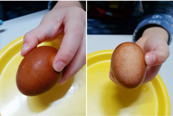 갈색으로 변한 달걀을 칫솔로 닦으면