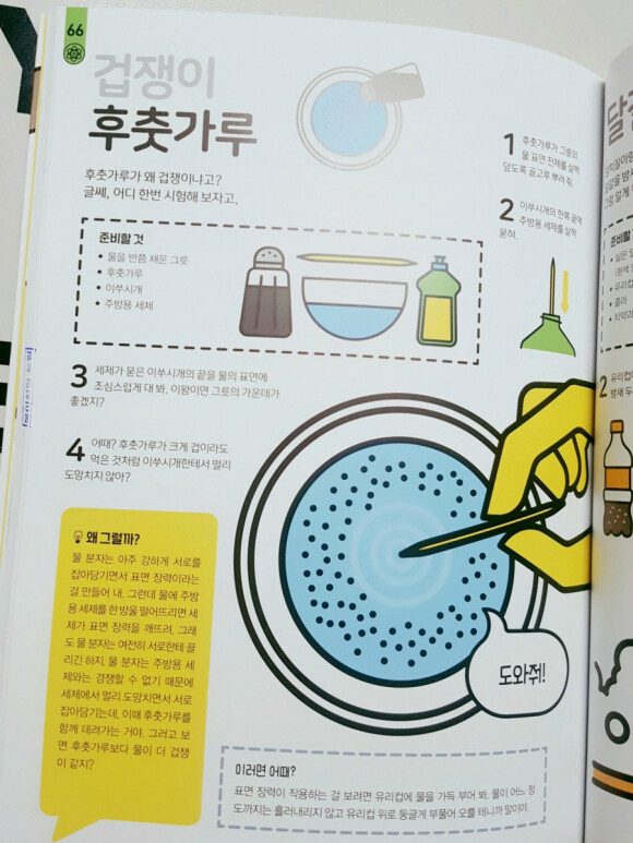 물에 후추를 뿌리고 이쑤시개 끝에 주방세제를 묻힌 후 갖다대면~ 과연, 어떻게 될까요? ^^