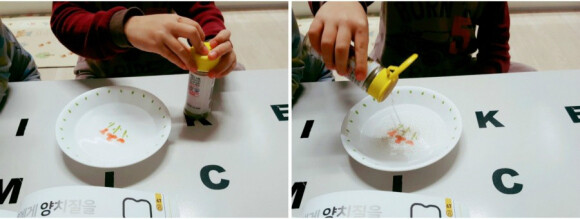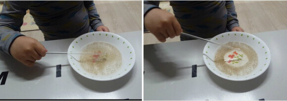 가운데 있던 후추가 바깥으로 움직이는 걸 확인할 수 있어요~ 물의 표면장력을 이용한 실험이었는데 아이가