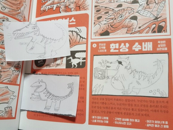 아들과 함께 특징을 읽고 현상 수배 중인 악당 공룡 그리기