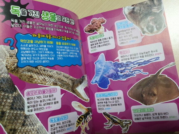 책에는 독을 가진 생물의 이름, 생태, 종류, 호기심 코너로 나누어져 독 생물들의