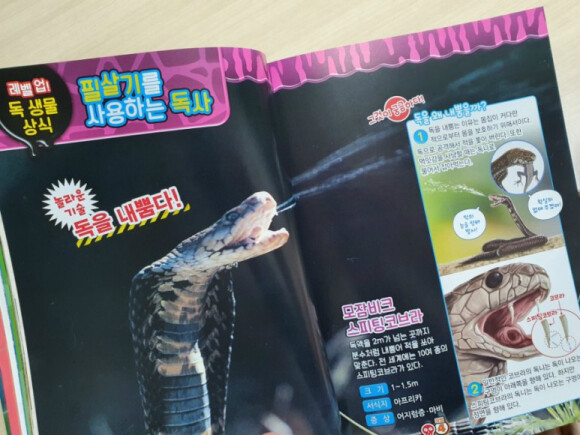 부분은 뱀이었다. 독을 내뿜는 뱀의 기술에 놀라워했는데 실제 사진과 함께 설명되어 있어 더 생동감이 느껴졌다.