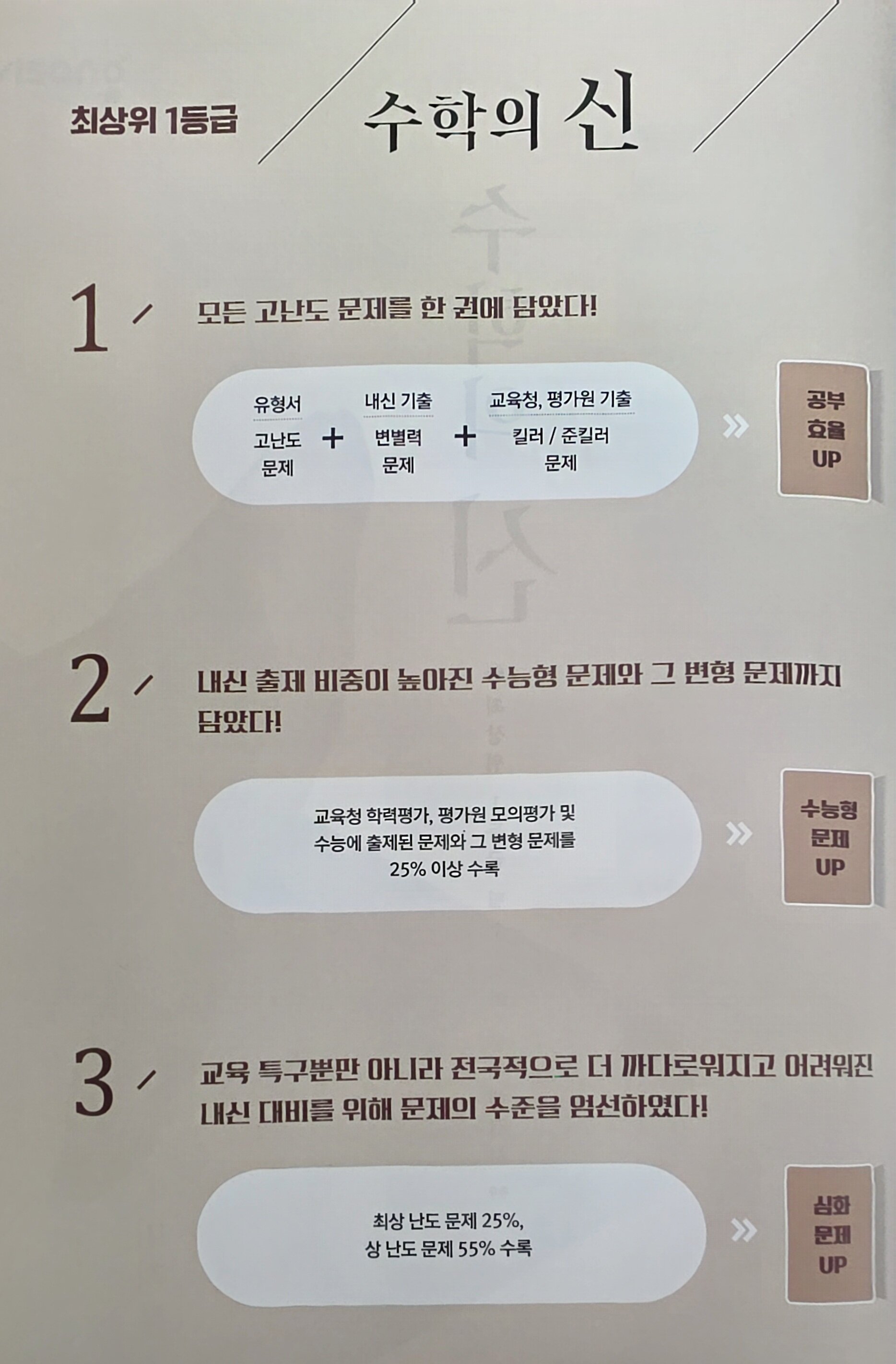 무작정 어려운 문제를 던져주는 게 아니라, 학생의 이해와 성취감을 함께 챙기는 구성이라 장기적으로 학습 의욕이 유지될수있게 해줄수있습니다.  또, 내신과 수능을 한 권으로 모두 대비할 수 있어 시간과 비용 면에서도 효율적입니다.