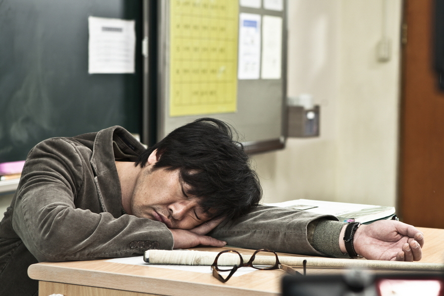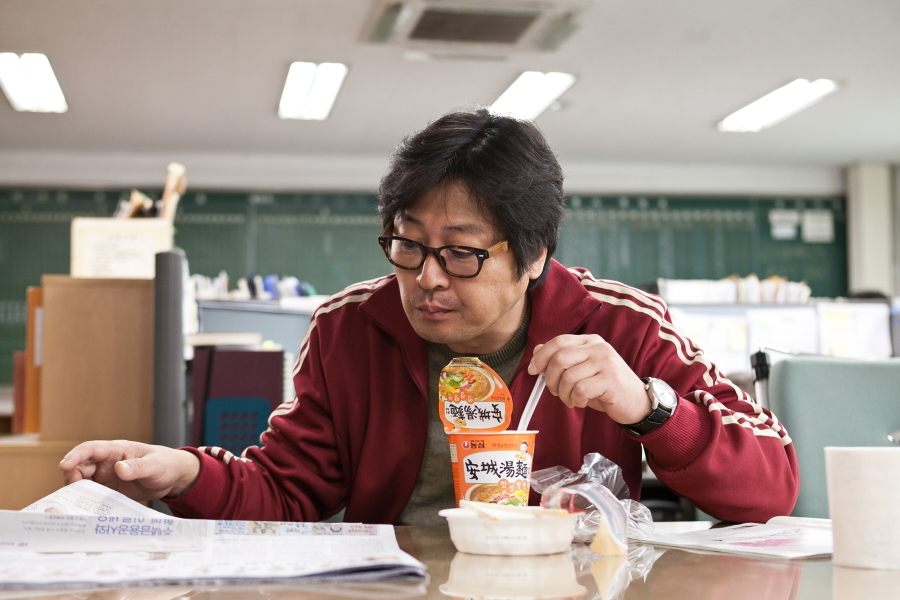 빗지 않은 듯한 머리와 구겨진 옷을 입고, 교무실 책상에서 컵라면을 먹고 남은 국물을