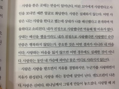 몇 교회를 거쳐 사역을 하면서 아이들에게 많은 사랑을 베풀었다. 나 스스로는 그것이 사랑이라고 생각하고, 때로는 아이들의 연락을 받으면서 아이들에게 큰 사랑을 베푼 것 같다는 생각이 들 때도 있다. 그러나 나는 과연 하나님의 사랑에 대해서 배신감을 느끼게 하지는 않았는지 생각해 보았다. 내가 베푼 사랑만 생각했을 뿐, 내가 받았던 사랑에 대해서는 생각하지 못했던 것이다. 저자는 사랑한 것에 대해서 말을 하고 있지만, 역설적으로 생각해보면 내가 얼마나 많은 사랑을 받고 있는지에 대해서 생각하게끔 만드는 것 같다.