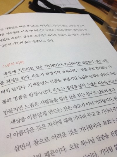 저자는 본서에서 많은 사람들에게 생각을 하게끔 만든다. '느려도 좋다'는 제목에 너무나 많은 의미가 내포되어 있다. 기다림, 사랑, 비움, 시간, 영성, 감성, 내면...