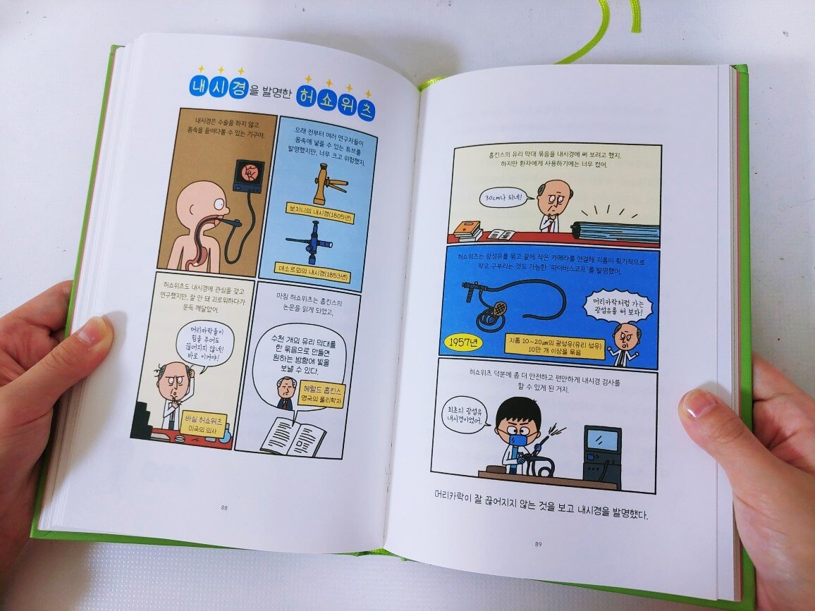건강검진을 받고 오니 아이가 내시경 검사에 관심을 가지길래 설명을 해줬는데 책에는 그림과 내시경의 개념, 특징, 유래, 발명한 과학자까지 한 장에 다 나와 있습니다