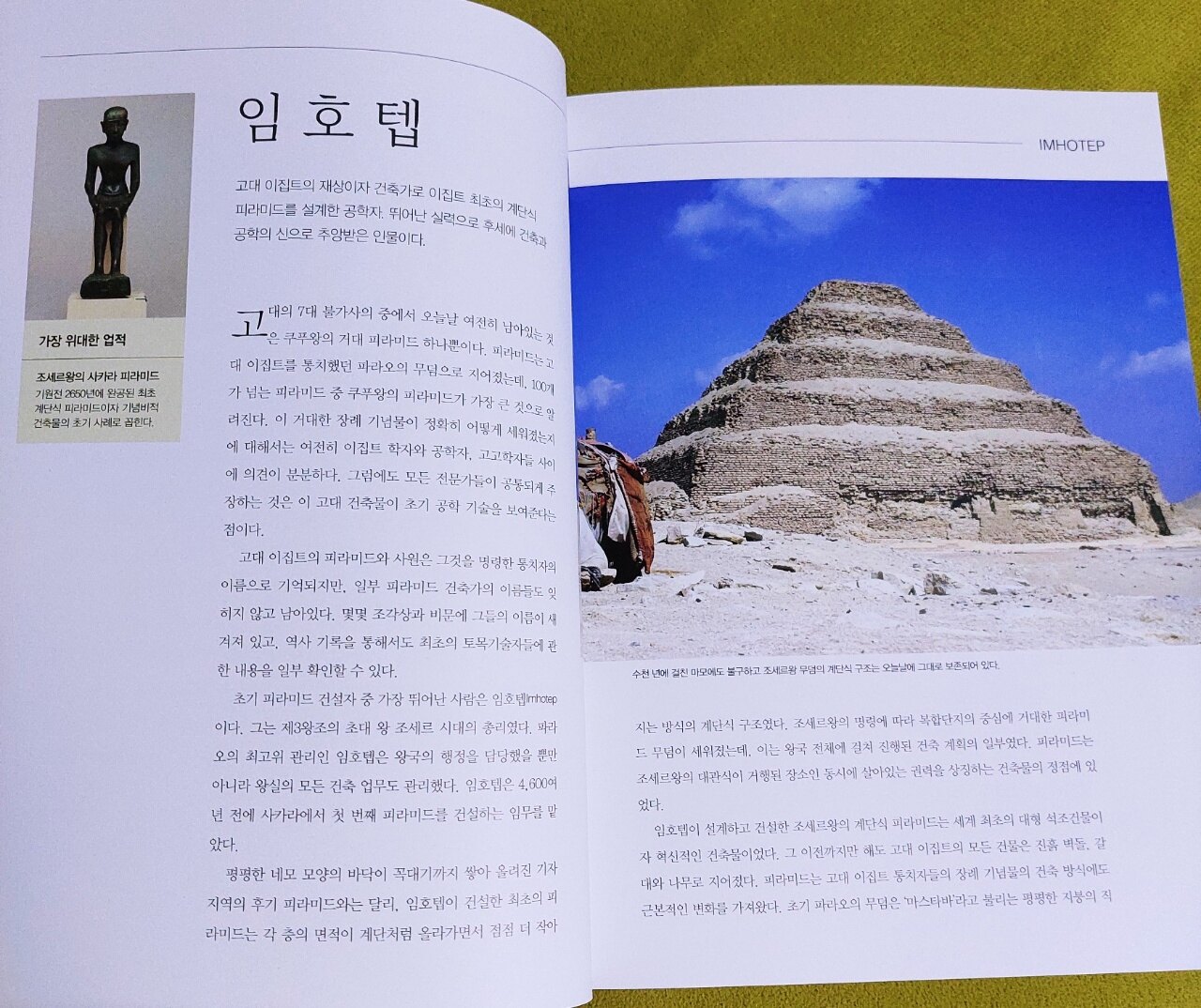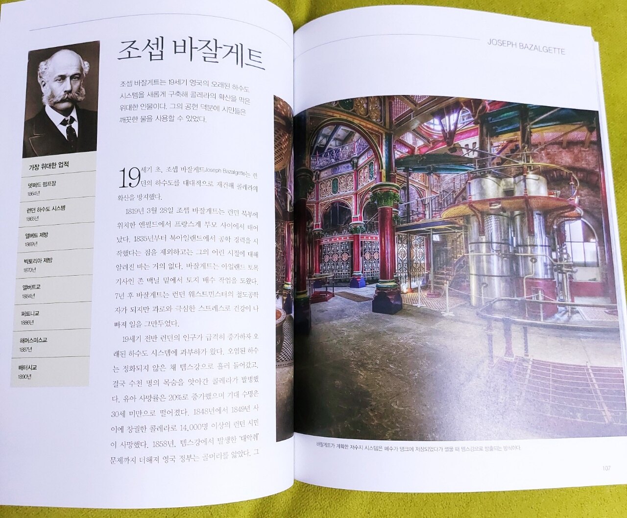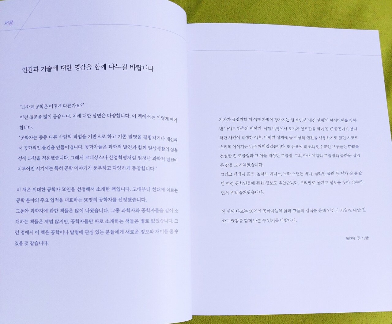현대 사회가 이렇게 발전한 것은 역사 속의 위대한 과학자, 공학자들이 있었기에 가능했습니다 그동안 과학자들의 이야기를 다룬 책들만 보았기에 공학자들의 이야기가 담긴 이 책이 흥미로웠고 너무나 궁금했습니다 과학자와 공학자의 차이를 알고 이해하며 공학자들에 대해 배워보겠습니다 같은 과학이면서 다른 두 분야를 정확히 이해할 수 있는 기회가 되어 좋았습니다 책에서 가장 먼저 소개되는 공학자는 고대 이집트의 재상이자 건축가인 임호텝입니다 영화 미이라에 등장하는 임호텝은 악역으로만 기억되는데 실존 인물은 위대한 공학자였습니다 이집트 최초의 계단식 피라미드를 설계했으며 건축방식의 변화를 가져온 계기가 되었습니다 그 당시 기술로는 힘들었을 텐데 기초적인 도구만으로 지어졌다는 게 놀랍습니다 약 18년에 걸쳐 만들어진 계단식 피라미드가 수천 년이 지난 지금까지 보존된다니 대단합니다 이집트 피라미드의 거대함, 웅장함, 감동을 직접 보고 느껴보고 싶습니다 바다 위 경도를 정확히 측량해낸 공학자 "존 해리슨"입니다 이분의 업적은 놀랍고 경이롭습니다 잔잔한 바다는 아름답지만 언제 돌변할지 모르는 게 바다입니다 예측하기 힘들기에 육지보다 위험한 바다에서는 위험하고 안타까운 사고가 많이 발생합니다 1707년 영국 전함이 항로를 착각해 암초와 충돌하여 배가 충돌하는 사건이 발생하고 약 2천여 명이 목숨을 잃었습니다 이 사건을 계기로 영국 의회는 해결하는 사람에게 상금을 걸었고 존 해리슨은 초정밀시계가 경도 문제를 해결하는 해답이라고 생각하고 도전합니다 시계를 제작하는 직업을 가지고 끊임없이 연구하며 개발하던 존 해리슨은 자신의 인생을 시계에 쏟아부으며 60대에 이르러 해상시계 "H4"를 탄생시킵니다 바다 위에서 침몰하면 죽음밖에 선택지가 없습니다 누군가의 노력과 희생으로 많은 사람들이 생명의 안전을 보장받고 항해할 수 있다는 건 대단하고 감동적인 것 같습니다 공학자 존 해리슨의 이야기는 매우 감명 깊었습니다 19세기 영국의 오래된 하수도 시스템을 새롭게 구축해 콜레라의 확산을 막은 "조셉 바잘게트" 또한 위대한 공학자입니다 런던의 인구 급증으로 오래된 하수도 시스템에 과부하가 오자 오염된 하수가 정화되지 않고 템스강으로 흘러가 콜레라가 발병합니다 이로 인해 14,000명 이상의 런던 시민이 사망하고 오염된 물과 악취로 시민 모두가 고통을 받습니다 이때 런던 수도 이사회의 수석 공학자였던 바잘게트는 런던의 희망이었습니다 이분이 고안한 하수도로 인해 수많은 사람들을 전염병으로부터 구했고 런던을 살기 좋은 도시로 만들었습니다 누군가의 노력이 없었다면 더 많은 사람들이 죽고 병들며 고통에 쌓였을 텐데 위대한 공학자들 덕분에 인류는 한 단계 성장하며 더 나은 세상을 만들어 갑니다 책에서 소개해 주는 50인의 위대한 공학자들은 너무나 대단하고 존경스러운 분들이며 이들을 통해 아이들이 꿈을 키우며 미래를 향해 나아갈 수 있습니다 세계 속의 공학자들이 자신의 인생을 걸어 이뤄낸 업적으로 우리가 누리는 모든 것들에 감사하며 아이들도 멋진 어른으로 성장한다는 다짐을 했습니다 스스로 발전하고 나아가는 아이들 앞에는 이렇게 위대한 공학자들이 있기에 미래가 밝고 희망이 가득한 것 같습니다 이 책은 아이들 어른들 모두 읽어보시길 추천합니다