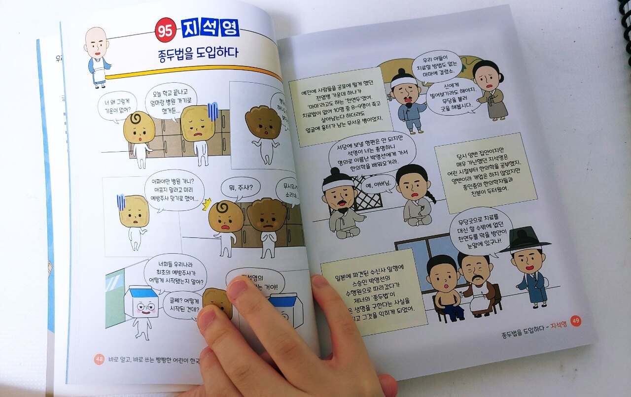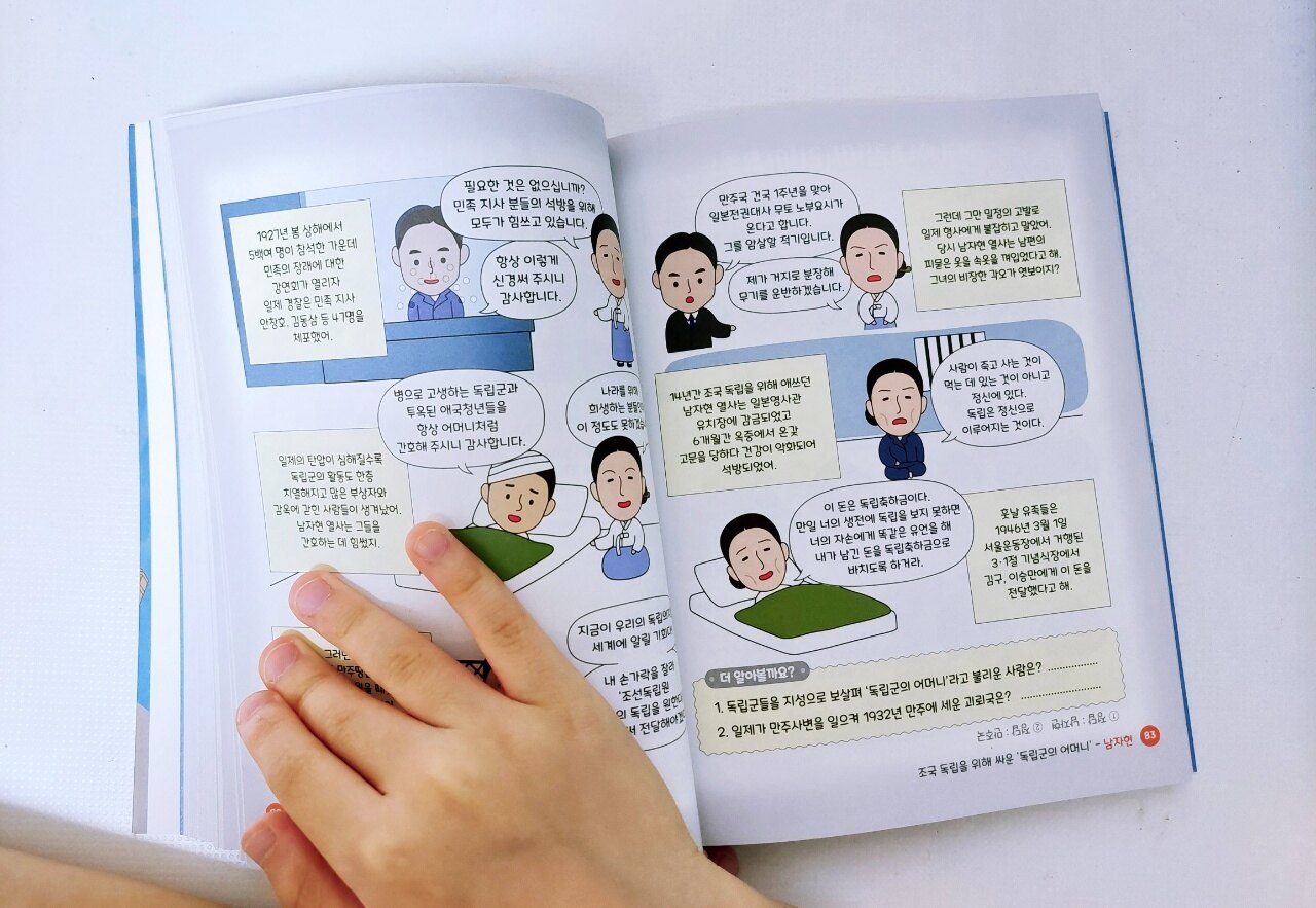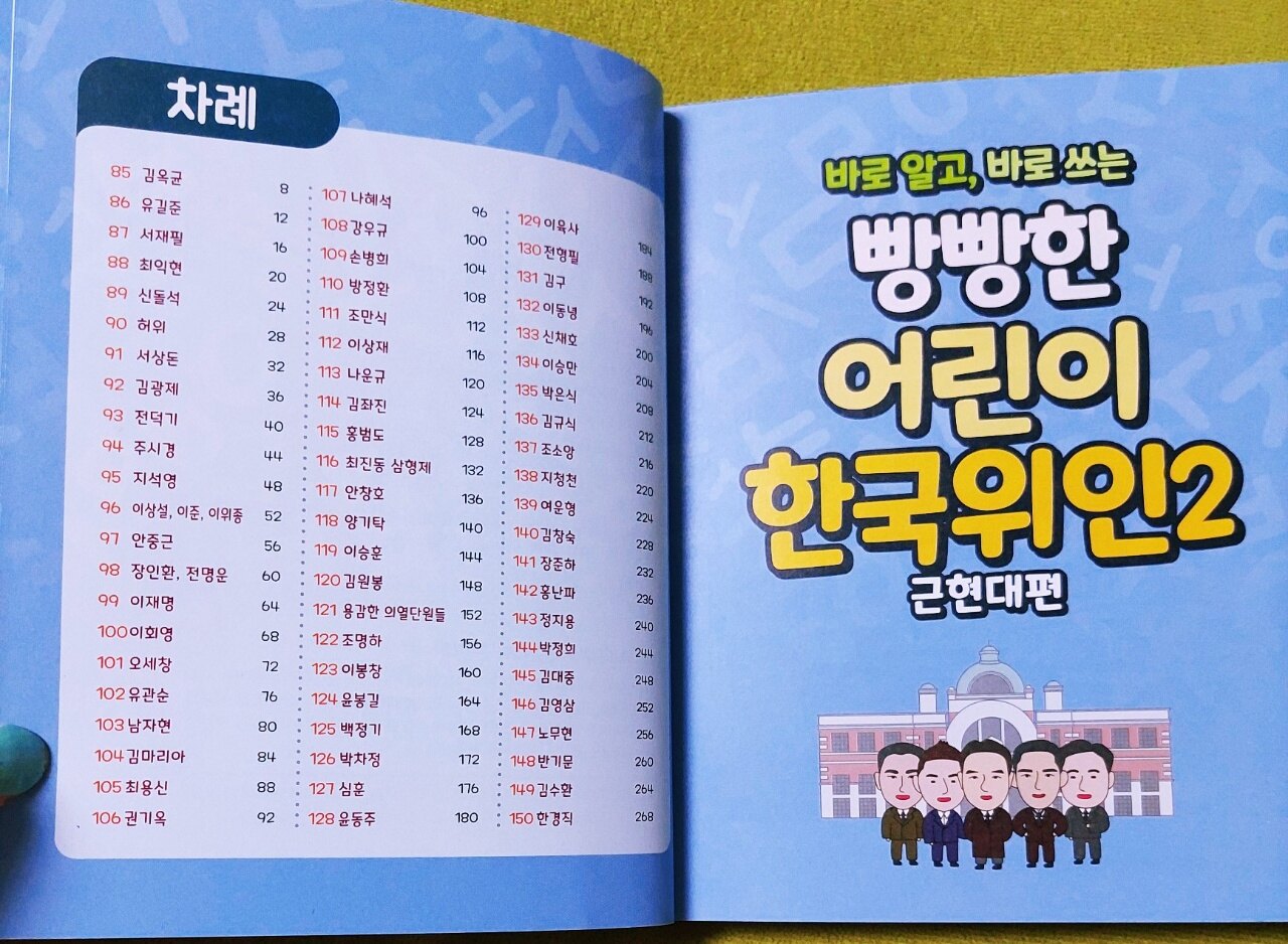 우리 아이 빵빵 시리즈는 아이들이 좋아하는 책이라 인기가 많습니다 집에 몇 권이 있는데 친구들도 좋아해서 매일 학교에 가지고 다닙니다 학교에서 수업 시작 전에 독서 시간을 주는데 재밌게 읽고 있습니다 쉬는 시간마다 친구들이 빌려서 읽을 정도로 인기 있는 책인데요 우리 아이 빵빵 시리즈 이번에 읽은 책은 <빵빵한 어린이 한국위인 2: 근현대편> 입니다 우리나라 역사 인물들을 배우고 어떤 활동을 했는지 읽으면서 그 시대 상황을 이해하고 알아가는 책입니다 다소 어려울 수 있는 한국사를 만화 형식으로 재밌고 이해하기 쉽게 설명해 주기에 아이들 역사 공부에 너무나 좋은 책입니다 책에 등장하는 인물들은 교과서에 나오는 유명한 분들도 있고 다소 생소한 분들도 있습니다 어른인 저도 이 책을 통해 많은 것을 배웁니다 우리나라를 위해 애써주신 분들인데 점점 잊히는 거 같아서 반성하며 읽었습니다 아이들 책을 함께 읽으며 어른들도 같이 성장하는 시간을 가지게 되니 서로에게 좋은 영향을 주는 것 같아서 항상 모든 책을 같이 읽습니다 빵빵한 어린이 한국위인 근현대편 1권은 84명의 위인이 나오고 2권은 66명의 위인이 나옵니다 총 150명의 역사적 위인들을 알려 주고 이분들의 활동과 업적을 통해 우리나라를 아끼고 사랑했던 마음을 아이들도 느끼고 배울 수 있습니다 한국사의 시대는 전근대와 근현대로 나누어집니다 전근대 역사는 고조선, 삼국, 발해, 통일신라, 고려, 조선시대를 말하며 근현대 역사는 보통 서양에 문호를 개방한 시기부터 지금 우리가 살고 있는 현대 시기까지를 말합니다 근현대 역사는 지금 우리와 가장 가까운 역사입니다 개항 이후 근대국가 수립과 국권 회복을 위해 애쓴 애국지사들과 의병 활동, 그리고 일제강점기에 나라의 독립을 위해 피를 흘린 독립운동가들의 활동을 통해 역사를 올바르게 이해하고 배우는 시간을 가졌습니다 아이가 책을 읽으며 "한국을 빛낸 100명의 위인들" 노래에 등장하는 인물들은 더 집중해서 읽습니다 평소 읽었던 책에 나오는 인물이거나 노래에 등장하는 아는 이름이 나오면 자신이 알고 있는 정보와 비교하며 읽고 새롭게 배우는 것들은 반복해서 한 번 더 읽으며 인물에 대해 더 많이 이해하면서 읽었습니다 노래 가사는 인물과 업적을 간단히만 알려주기에 잘 모르고 있었는데 책에서 자세히 알게 되니 재밌다고 합니다 만화로 읽어서 역사 공부가 쉽고 재밌다니 빵빵 시리즈 덕분에 한국사를 자연스럽게 공부하게 되어 좋습니다 아이가 군대는 왜 남자만 가냐고 질문을 하기에 여자보다 힘이 세고 가족과 나라를 지키기 위해 의무적으로 군대에 가서 배우는 거라고 이야기해주며 여군도 있는데 여자는 군대에 가는 게 의무는 아니고 스스로 지원해서 간다고 말해줬습니다 책에서 조국 독립을 위해 싸운 "독립군의 어머니" 남자현 위인이 나옵니다 그 당시에 여자의 몸으로 독립운동을 하며 나라를 위해 애쓰다 다치거나 병든 독립군들을 간호하며 돕습니다 나라를 위한 마음과 그녀의 강한 정신은 존경스럽고 대단하다고 생각합니다 최초의 영한사전을 만든 사람이 게일이라는 영국인이며 그를 도운 한국인이 양기탁 위인이었습니다 대한매일신보를 창간하여 나라를 위해 힘썼지만 일본의 방해로 많은 고생을 합니다 신민회로 독립운동을 하지만 여러 번 체포당해 옥살이를 하고 한평생 바쳐 독립을 위해 애썼지만 광복을 보지 못하고 중국 땅에서 생을 마감합니다 책을 읽으며 역사를 지켜온 위인들을 배우며 그때의 시대상을 이해할 수 있었고 그분들의 간절한 마음에 감동하며 뜻깊은 시간을 보냈습니다 만화로 보니 전혀 지루하거나 어렵지 않아서 아이들이 집중해서 잘 읽었습니다 이 책을 아이들과 함께 읽어보시길 추천합니다