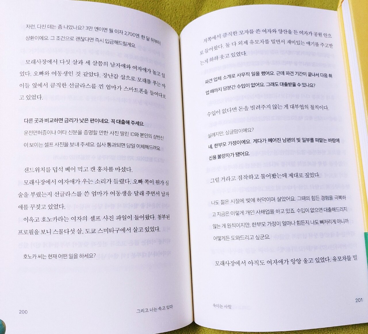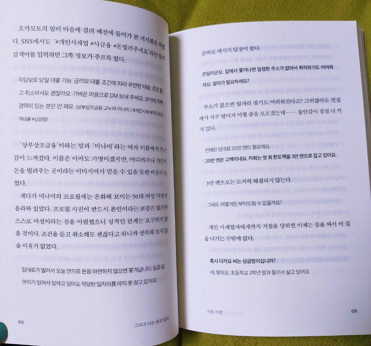 왜 두 번 읽어야 되는지 알게 되는 미스터리 장편 소설 " 그리고 너는 속고 있다" 는 충격적인 반전으로 독자를 놀라게 합니다 제목 그대로 속고 있는데 어디서부터 속은 걸까요 다 읽고 다시 앞으로 가서 읽으니 이해가 갑니다 정말이지 몰입해서 읽었는데 놓치고 있는 부분들이 많았고 결말도 충격적입니다 현실에서 일어나는 일들이기에 많은 생각을 하게 되는 소설입니다 일본 소설은 특유의 놀라운 반전으로 매번 읽을 때마다 흥미로운데요 이번 "그리고 너는 속고 있다" 역시 재미있게 읽었습니다 주인공 다카요는 초등학교 2학년인 어린 딸과 함께 사는 싱글맘입니다 남편의 폭력으로부터 도망쳐 둘이 숨어 사느라 한 부모 가정 지원도 받지 못한 채 가난하게 살아갑니다 아이를 돌봄 센터에 맡기고 일을 하는 것도 여의치 않고 할 수 있는 일은 한정적입니다 콜센터에서 일했지만 정신적인 트라우마로 그만두고 병원에 다니며 상담 치료 중이고 편의점 알바로는 둘이서 살아가는 게 많이 힘듭니다 결국 돈이 없어 임대료가 3개월 밀리게 되고 임대료 체납 독촉장을 받게 됩니다 독촉 전화는 계속 오고 강제 퇴거까지는 며칠 남지 않았습니다 어린 딸을 집 없이 생활하게 할 수 없는 다카요는 애써보지만 빌려주겠다는 지인도 가족도 없습니다 결국 다카요는 SNS로 고객을 모집하는 불법 개인 사채업자 미나미에게 돈을 빌립니다 다카요가 개인 사채업자 미나미한테 돈을 빌리기까지의 과정이 험난합니다 싱글맘이 어린아이를 데리고 일을 한다는 건 현실적으로도 어렵습니다 고소득 전문직이 아닌 이상 한계가 있고 제약도 많습니다 콜센터 상담은 버티기만 한다면 쉽게 구할 수 있는 직장이지만 별의별 사람들이 많기에 정신적인 스트레스가 어마어마합니다 다카요는 남편을 만난 것부터 잘못된 걸까요 남편의 언변에 속아 연대보증을 서게 된 아버지는 남편의 빚까지 떠안고 정든 집을 팔게 되고 그 충격 때문인지 다음 해 세상을 떠나십니다 엄마 역시 충격으로 급격히 늙고 치매 증상을 보이기 시작하고 언니가 요양원 비용을 내고 있습니다 집안은 망하고 자신은 아이와 먹고사는 것도 힘들고 당장 쫓겨나는 것을 막기 위해 사채를 쓰는 다카요가 이해가 가면서도 안타깝네요 자신을 찾는 남편이 무섭고 현실은 막막하고 아이는 가엽고 이어지는 불행은 다카요가 감당하기에 너무나 버겁습니다 사채를 쓰는 사람들의 이유가 다양합니다 막다른 골목에 이르면 판단이 흐려지는 걸까요 아니면 갚을 수 있다고 쉽게 생각하는 걸까요 사채가 아이러니한 게 바닥까지 간 사람들에게 높은 이자로 돈을 빌려줍니다 갚을 능력이 없는 사람들을 상대로 쥐어짜는 게 나쁘다고 할지 그마저도 없는 게 더 나쁜 건지 모르겠습니다 여성들은 성매매로 흘러가기도 하고 돌이킬 수 없는 선택으로 인생이 망가집니다 책에 나오는 고객과 사채업자와의 대화가 너무 현실적이라 읽으면서도 마음이 답답했습니다 위험한 순간도 많고 막막한 현실은 나아지긴커녕 빚 갚느라 악순환이고 어찌 된 게 빚은 계속 늘어납니다 다카요가 나쁜 선택을 할까 봐 걱정됐고 사채업자들이 돈을 더 빌리게 하거나 딜리버리 헬스점으로 보내려고 고객을 어떻게 구슬리는지 읽느라 놓친 부분이 많아서 놀랐습니다 작가에게 감쪽같이 속았네요 다카요가 조금은 나은 삶을 살길바랬는데 마지막 반전에 많이 놀랐습니다 소설의 내용에 놀라고 완벽하게 속은 저한테 놀랐네요 책 속의 등장인물들을 보며 인간의 이기심과 뻔뻔함이 너무나 안타깝고 답답했고 가여웠습니다 열심히 살아도 타의로 불행이 계속되는 사람들이 많습니다 마음이 무거워졌지만 소설 자체만 보면 반전의 재미가 있었습니다 현실적이면서 독자를 혼란에 빠트린 이 책은 기대이상으로 재밌습니다 읽어보시길 추천합니다 출판사로부터 도서를 제공받아 작성한 솔직 후기입니다