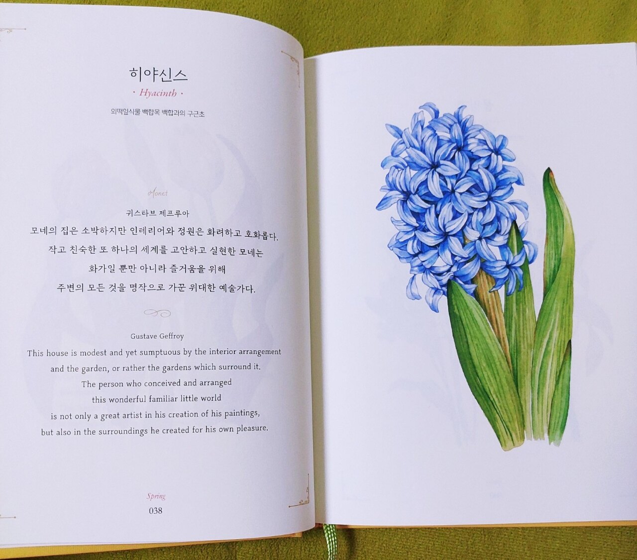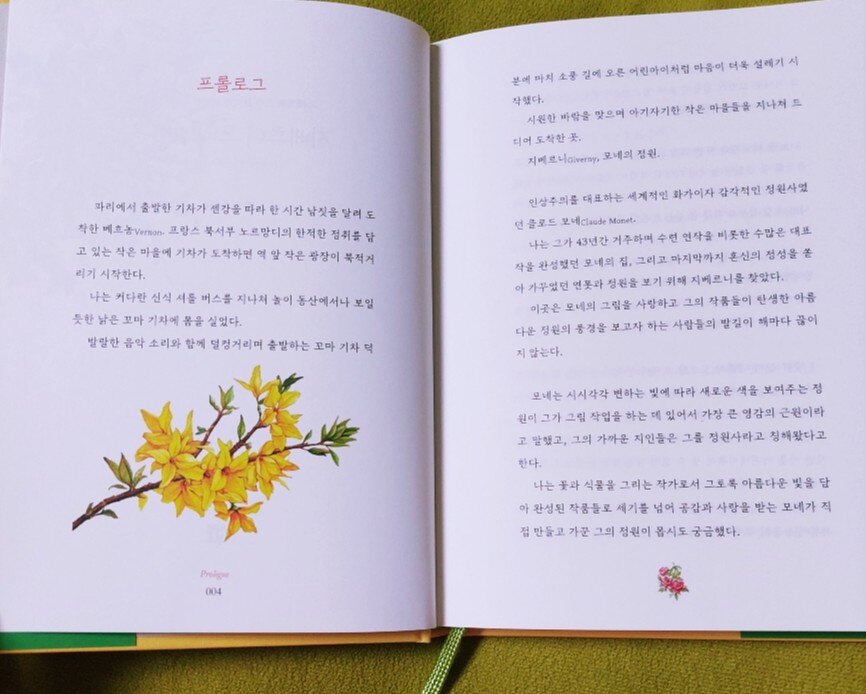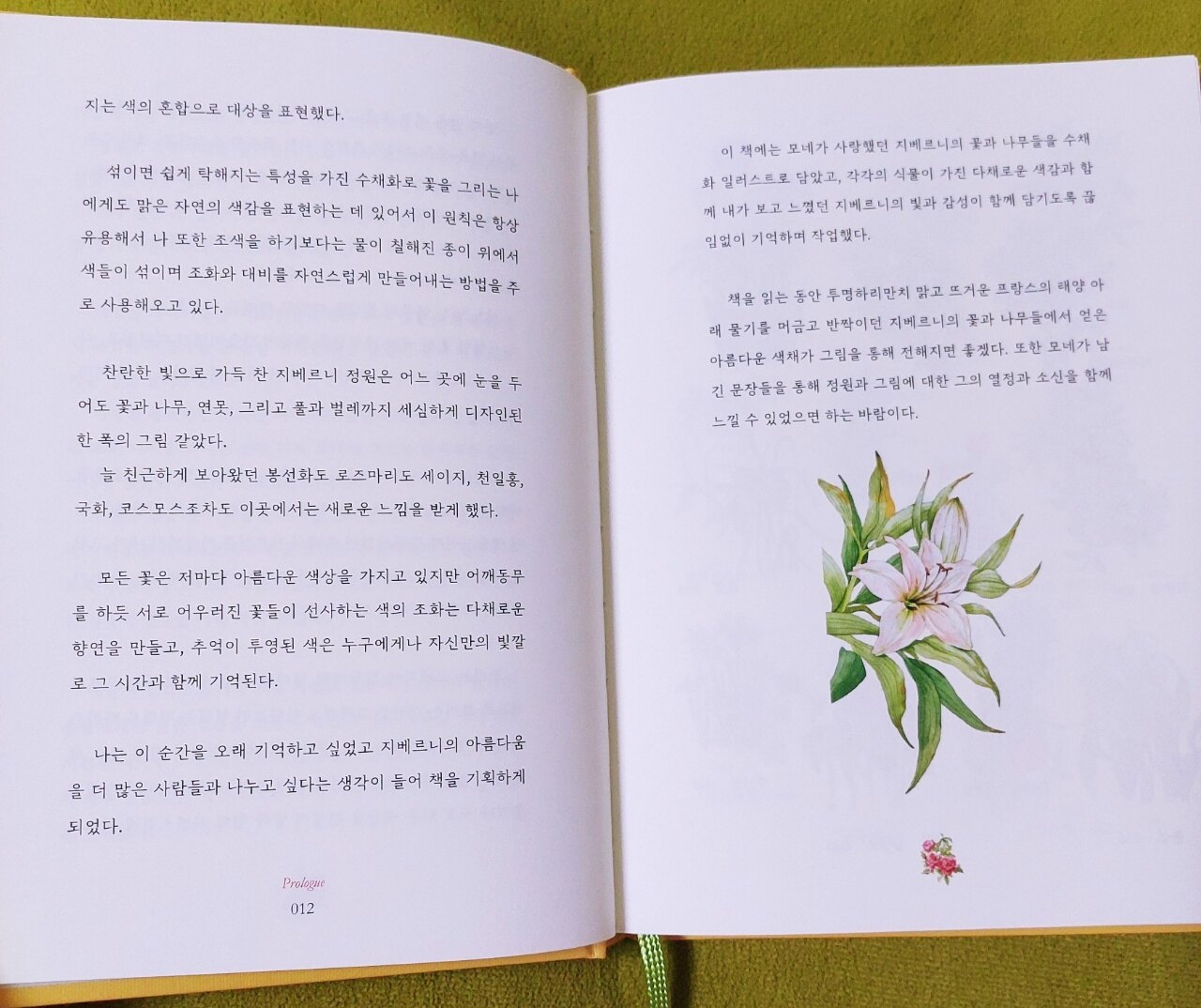 프랑스의 인상파 화가 모네는 인상파 양식의 창시자 중 한 사람입니다 사물이 빛에 따라 어떻게 변하는지 대기 중의 빛을 포착해 내며 빛의 변화를 섬세하고 아름답게 담아냈습니다 화가 모네는 자신이 그리고 싶은 풀, 나무, 꽃 등 아름다운 자연의 풍경을 직접 꾸미기 위해 정원을 만듭니다 지베르니의 작고 아름다운 매력에 빠져 그곳에 꾸미기 시작한 정원은 모네의 정성과 사랑이 가득 담겨있습니다 모네는 일 년 내내 시들지 않는 꽃의 아름다움을 유지하기 위해 꽃마다 피우는 시기를 다르게 하여 시간 차까지 계산했다니 이 정원에 얼마나 많은 정성을 쏟았는지 알 수 있습니다 화가면서 동시에 정원사였던 클로드 모네의 정원을 보려고 방문하는 사람들이 매년 많습니다 이곳에서 영감을 받아 탄생한 모네의 수많은 작품들을 보며 모두가 이 정원을 사랑합니다 이 책의 저자 박미나 수채화 작가 역시 직접 프랑스를 찾아 지베르니의 아름다움을 눈으로 직접 보고 그림을 그렸습니다 박미나 작가는 자신이 보고 느꼈던 지베르니의 빛과 감성이 담긴 아름다움을 이 책에 담아 많은 사람들이 알고 그 감동을 함께 느끼길 바라며 모네가 사랑했던 지베르니의 꽃과 나무들을 수채화 일러스트로 담았습니다 지베르니의 꽃과 나무들의 아름다운 색채가 그림을 통해 전해지길 바란다는 저자의 바램은 통했습니다 그림 하나하나가 너무 아름답고 감동적입니다 평소 모네의 그림을 좋아했기에 이 책은 저에게 큰 감동을 주었습니다 책에는 모네가 정성들여 키웠으며 지금까지 보존되고 있는 봄, 여름, 가을의 꽃과 나무 총 80여 종의 수채화 일러스트가 수록되어 있습니다 모네의 인생과 예술에 대한 80개 명언이 한글·영문으로 수록되어 있어 더 의미가 있습니다 이 명언들은 모네로부터 인생과 예술의 영감을 받을 수 있도록 그가 남긴 말들, 모네와 지베르니를 직접 본 예술가와 미술 평론가의 말들을 모아놓은 것입니다 그림 하나하나 문장 하나하나가 다 멋지네요 꽃을 통한 문장에서 세상을 살아가는 삶의 이치와 지혜를 배울 수 있었습니다 책의 뒷부분에는 지베르니 정원의 실제 모습들이 담겨 있습니다 저자가 지베르니 정원에서 느꼈던 벅찬 감동이 그대로 전해지며 왜 모두가 모네에게 빠져드는지 다시 또 깨닫습니다 너무나 예쁘고 멋진 책이라 소장해서 자주 꺼내보면 무거웠던 마음이 편안해집니다 마음의 위로가 필요할 때 힘들 때 이 책을 읽으며 위안을 느낍니다 꽃과 나무가 주는 감동을 느끼며 이 책을 읽어보시길 모두에게 추천합니다 북유럽카페의 소개로 출판사로부터 도서를 제공받아 작성한 솔직 후기입니다