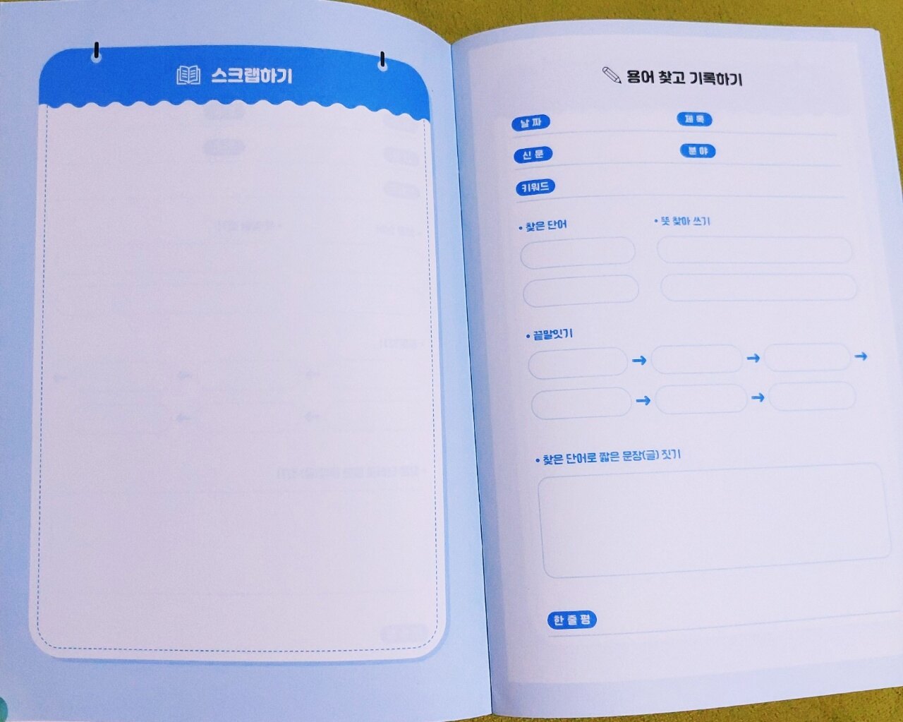 부록으로 같이 들어 있는 아이스크림 어린이신문 스크랩북을 활용하여 신문 기사를 스크랩하고 기록할 수 있습니다
