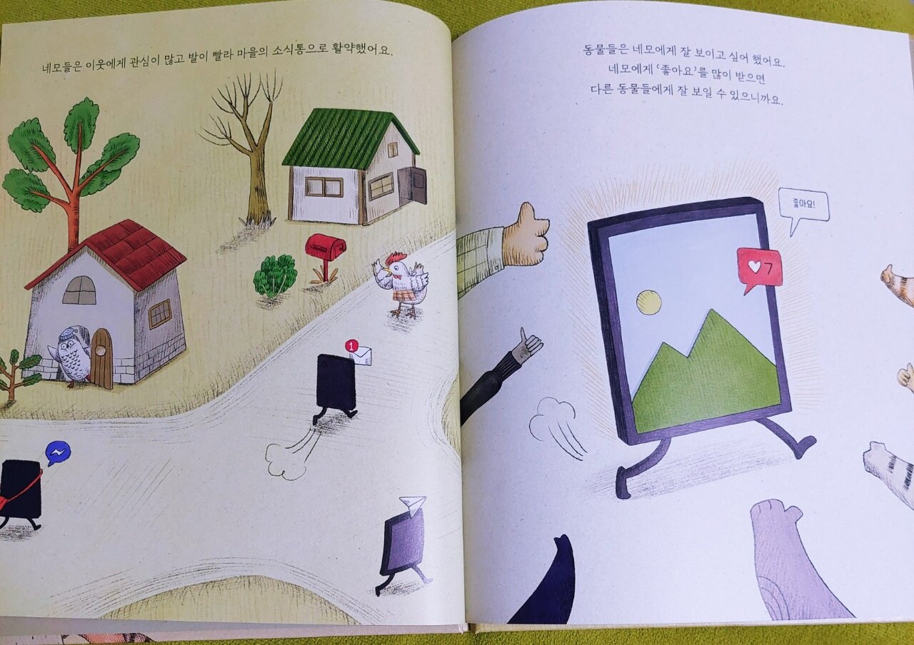 SNS에 좋아요 수가 많아야 만족되는건 대부분의 사람들이 느끼는 감정이 아닐까 생각됩니다 자신이 올린 글이나 사진에 대해서 인정받는 기분이 들고 뿌듯하지만 그만큼 노출도 많이 되기에 조심해야 되는 부분들도 많습니다 자신을 공개한만큼 책임도 따르는 SNS에서 좋아요가 차지하는 비중은 얼만큼일까요 아이들도 개인 SNS를 하면서 좋아요 수를 신경쓰는걸 보면서 많은 생각이 듭니다 이 책은 좋아요에 대해 동물들의 이야기로 재밌게 꾸민 책입니다 동물들이 지나는 길에 있는 네모 마을에는 네모와 다양한 동물이 모여 살고 있습니다 이웃에게 관심도 많고 발도 빠른 네모들은 소식통으로 활약하며 동물들에게 좋아요를 보내줍니다 동물들은 좋아요를 많이 받아야 잘 보일 수 있다 생각하고 네모에게 잘 보이려고 노력합니다 자신의 모습을 바꾸기도 하고 남을 흉내내기도 하면서 각자의 방법으로 네모에게 좋아요를 받았습니다 책을 읽고 비둘기를 보면서 느낀게 많습니다 온라인에서 보여지는 모습들이 다 진짜는 아닙니다 좋아요를 받고 남들에게 잘 보이고 싶어서 자신을 거짓으로 꾸민 비둘기는 잘못이 있을까요? 비난받고 숨어버린 비둘기는 그저 친구들에게 관심받고 싶었을 뿐인데 비둘기가 한 잘못은 무엇일까요? 거짓이 난무하는 SNS에서 아이들이 상처받지 않고 자신을 당당히 표현하며 성장하길 바랍니다 마지막에 등장하는 거북이처럼 자신의 길을 가며 주변보다 자기 자신을 사랑하길 바라고 어떤 방향을 가든 즐겁게 긍정적으로 살아가길 바라며 이 책을 아이들과 함께 읽어보시길 추천합니다 출판사로부터 도서를 제공받아 작성한 솔직 후기입니다
