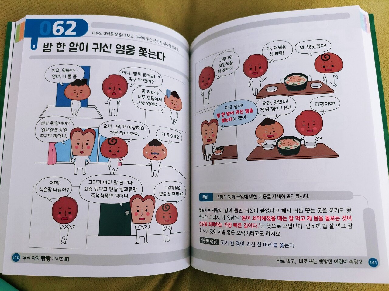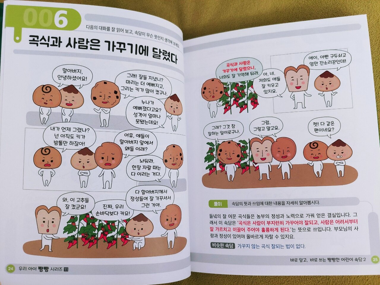 속담은 옛날부터 전해내려오는 관습적인 표현으로 오랜시간동안 경험에서 나오는 시적인 말입니다 속담에 담긴 뜻은 사람들에게 통찰을 주고 교훈을 주며 깨달음을 줍니다 우리가 일상 생활 속에서 많이 쓰는 속담은 반드시 알아야 하는데요 고사성어와도 호환되기에 연관지어 익히면 한자 공부,문해력 향상에 도움이 많이 됩니다 아이들이 속담을 생각보다 어렵게 생각해서 재밌게 익힐 수 있게 자주 들려주고 책을 읽게 하고 있습니다 책을 읽은 후에는 수시로 퀴즈를 냅니다 서로 맞추려고 집중하는 모습이 귀여운데요 퀴즈를 통해 속담을 많이 알게 되었고 즐겁고 재밌게 익히며 놀이도 되니 좋습니다 가장 먼저 고민해야 할 일은 속담 도서를 잘 고르는 겁니다 아이들이 거부감 없이 재밌게 읽어야 하기에 많은 도서를 살펴봤습니다 그 중에서 고른 빵빵 시리즈는 아이가 너무 좋아하는 책입니다 어른인 제가 봐도 너무 재밌습니다 아이들이 알아야 할 필수 속담 120개가 수록되어 있습니다 이 책에 나오는 것만 알아도 일상 속에서 쓰이는 속담을 거의 다 아는건데요 알차게 구성되어 있어서 너무 만족스럽습니다 책을 재밌게 만들어주는 이야기 속 등장인물인 빵빵 가족은 다양한 빵모양으로 웃음을 주고 귀여운 얼굴로 친근함을 느끼게 합니다 빵빵 가족은 아이들이 이 책을 좋아하는 이유 중 하나입니다 표정 하나하나에 디테일이 살아있고 표현을 너무 잘해놔서 아이들이 집중해서 읽다 보면 속담을 쉽게 이해하고 자연스럽게 외워집니다 만화 형식의 대화라서 눈에 잘 들어옵니다 속담을 단편 이야기로 읽고 속담의 뜻과 쓰임을 다시 읽고 이해하며 비슷한 속담까지 연관지어 익힙니다 설명이 짥고 간결해서 아이들이 읽기에 편합니다 아이가 어릴 때부터 고사성어와 속담에 관심이 많고 좋아해서 집에 관련 책이 많은데요 유독 빵빵 시리즈를 좋아합니다 재밌다고 사달래서 모으기 시작했는데 읽고 또 읽고 반복해서 읽습니다 자기 전에 매일 30분 이상은 퀴즈를 내줘야 자는데요 하루는 사자성어 하루는 속담 하루는 수수께끼를 번갈아 매일 해주고 있습니다 재밌다고 하는 아이가 기특하고 예뻐서 매일 퀴즈를 내주다 보니 저도 같이 실력이 늘고 있습니다 우리 아이 빵빵 시리즈는 모든 책이 다 좋은 것 같습니다 매번 어떤 책부터 살지 온라인 서점 미리보기를 보고 골라서 아이가 좋아하는 내용을 우선 순위로 사주는데 아마 다 사지 않을까 싶습니다 이번에 고른 "바로 알고,바로 쓰는 빵빵한 어린이 속담2" 책이 너무 좋아서 속담 어려워하는 아이들에게 추천합니다 이 책을 통해 속담이 재밌다는걸 알 수 있을거라 생각합니다